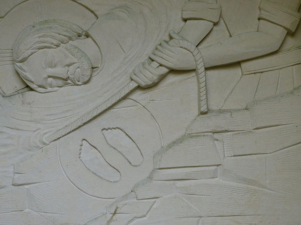 Ce bas-relief montre Jésus allongé, peut-être ayant chuté. Un homme le tient fermement attaché et tire sur la corde pour le relever. Nous voyons deux traces de pieds qui pour les voyageurs qui sont allés à Jérusalem, nous disent qu’on voit encore quelques restes des vestiges des pieds de notre Seigneur, qu’il voulut imprimer ses empreintes dans le rocher en passant le torrent du Cédron.